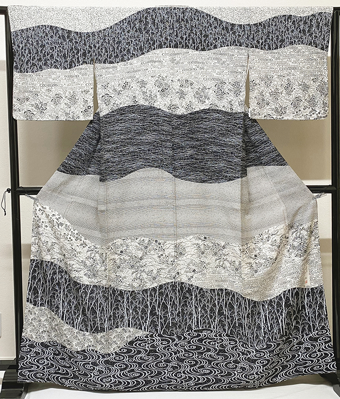 しなやかな手触りで確りと打ち込まれた重め一越生地を白に黒のロウ吹雪を重ねて染め、斜め横段取りに流水や木立・花柄などを青ネズのロウケツ蒔絵で丁寧に重ね染めした品。八掛けは正絹グレー色の縁取りにアラレの柄を白とグレー色で染めた額縁染めの品が付き、胴裏は正絹が付いた手縫い仕立て。蒔絵友禅伝統工芸師・水谷滉作、下前オクミに作家名と落款があります。
