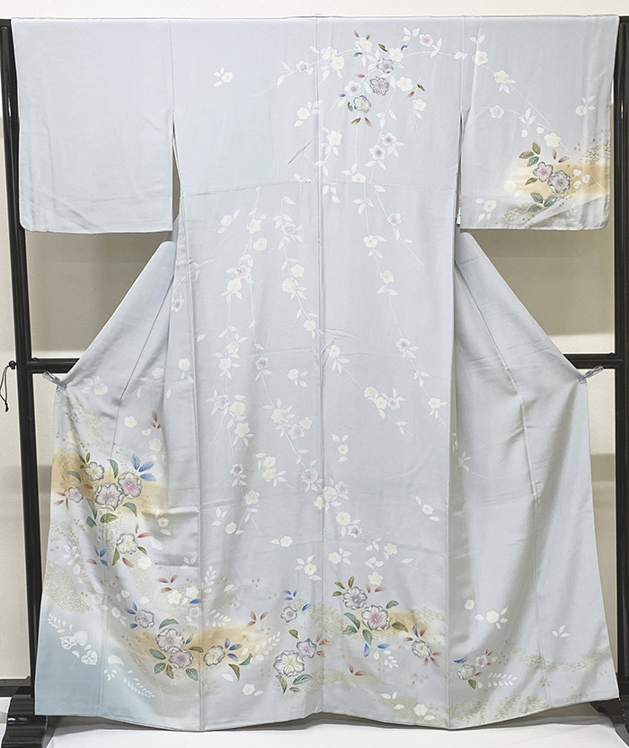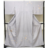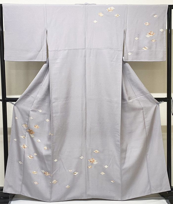 しなやかな手触りの良い小さなアラレ柄を織り込んだ紋意匠生地で、銀ネズ色に少しの藤ネズ色を加えた優しい地色に、胸や上前などの松皮菱取り小花などの柄をウグイス色やベージュ色に金彩を加えて染め、上前の小花の柄に少しの刺繡を加え仕上げた品。八掛けは正絹藤ネズ色暈しで胴裏は正絹が付いた手縫い仕立て。