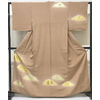 確りとした張りのある変わり一越織り生地で、くすんだ金茶色の地色に、胸や上前などの金彩暈しに、木立や花などの柄を白に緑色などで染めた品。八掛けは正絹くすんだ金茶色暈しで胴裏は正絹が付いた手縫い仕立て。