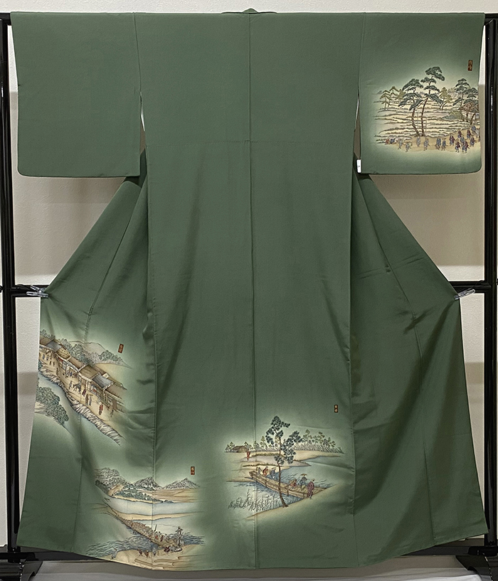 確りとした良い手触りの変わり一越織り生地で、優しい緑色の地色に、両袖や上前などに吉原や岡崎に藤川などの景色や行列などの柄を薄茶色やエンジ色に紫色などを加え丁寧に染めた品。八掛けは正絹表色無地でオクミ裏に柄を置き胴裏は正絹が付いた手縫い仕立て。衿裏にはホック代わりに糸が付いています。