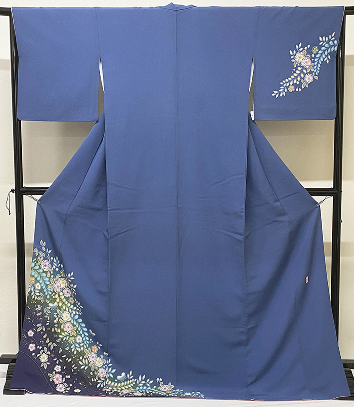 確りとした良い手触りの変わり一越織り生地をくすんだ深い青色の地色に染め、裾は緑色と青色で暈し、胸や上前などの辻ヶ花調の柄を黄色や薄紫色に青色やローズ色などに少しの金彩を加えアラレに染めた品。八掛けは正絹藤ローズ色暈しで胴裏は正絹が付いたミシン縫い仕立て。翠山工房謹製、下前オクミに落款があります。