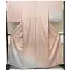 しなやかな手触りの小さな格子柄を織り込んだ紋意匠織り生地で、優しい薄ローズ色の地織りに、裾の水色暈しの上に、花の柄を白や薄緑色に少しの金糸を加えた刺繍で仕上げた品。八掛けは正絹藤ネズ色暈しで胴裏は正絹が付いた手縫い仕立て。衿裏にはホック代わりに糸が付いています。正絹の青ネズ色無地の重ね衿が付いています。