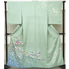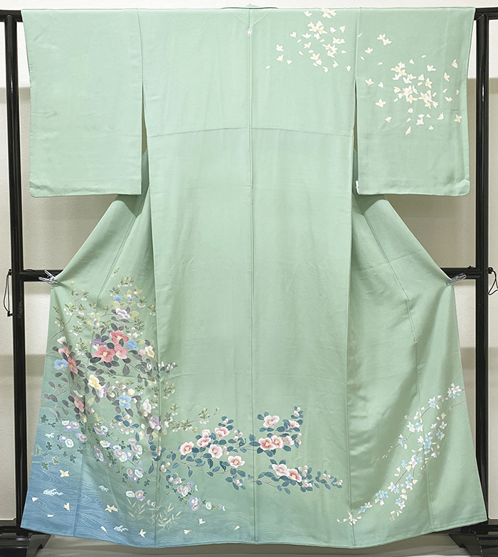 しなやかな手触りの変わり一越の生地を華やかな青磁色に地染めし、上前からのくすんだ水色の裾暈しと、枝花の柄をピンク色や薄紫色・山吹色・青色などの糸目友禅で丁寧に重ね染めした品。八掛けは正絹表色無地でオクミ裏に柄を置き胴裏は正絹が付いた手縫い仕立て。