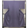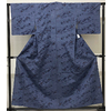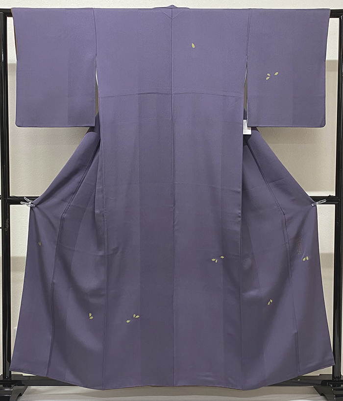 確りとした良い手触りのヨロケ縞の地柄を織り込んだ紋意匠の生地を落ち着いた青紫色に地染めし、上前からの花びらの飛び柄をウグイス色と縁取りに金彩を加え重ね染めした品。八掛けは正絹濃いカーキ色無地で胴裏は正絹が付いた手縫い仕立て。衿裏にはホック代わりに糸が付いています。ジュサブロー監修、下前オクミに作家名があります。パールトーン加工済み、下前衿先裏にタグがあります。