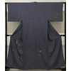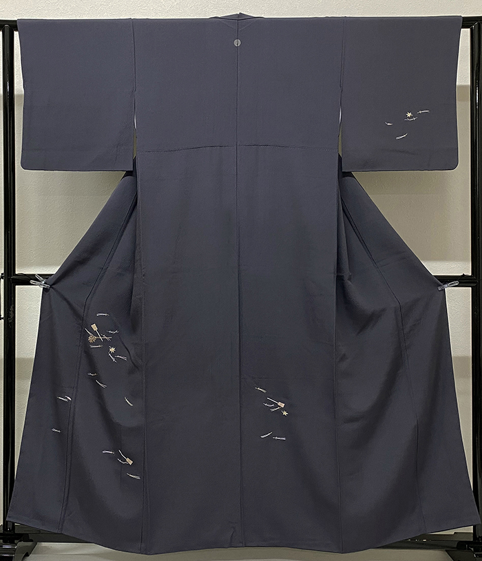 確りとした良い手触りの変わり一越の生地を墨ネズに地染めし、上前からの松葉など吹き寄せの柄を白と金茶色・金銀糸などの手刺繍で仕上げた品。八掛けは正絹表色無地で胴裏は正絹が付いた手縫い仕立て。パールトーン加工済み、下前衿先裏にタグがあります。