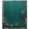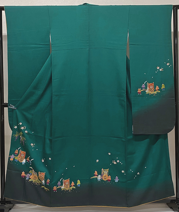 確りとした張りのある手触りの無地意匠の生地を深い緑色に地染めし、黒の裾暈しと、上前からの御所車に花や人物などの柄を黄赤色や白ネズ・エンジ色・ウグイス色・金糸金箔などの刺繍で仕上げた品。八掛けは正絹金茶色無地で胴裏は正絹が付いた手縫い仕立て。