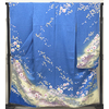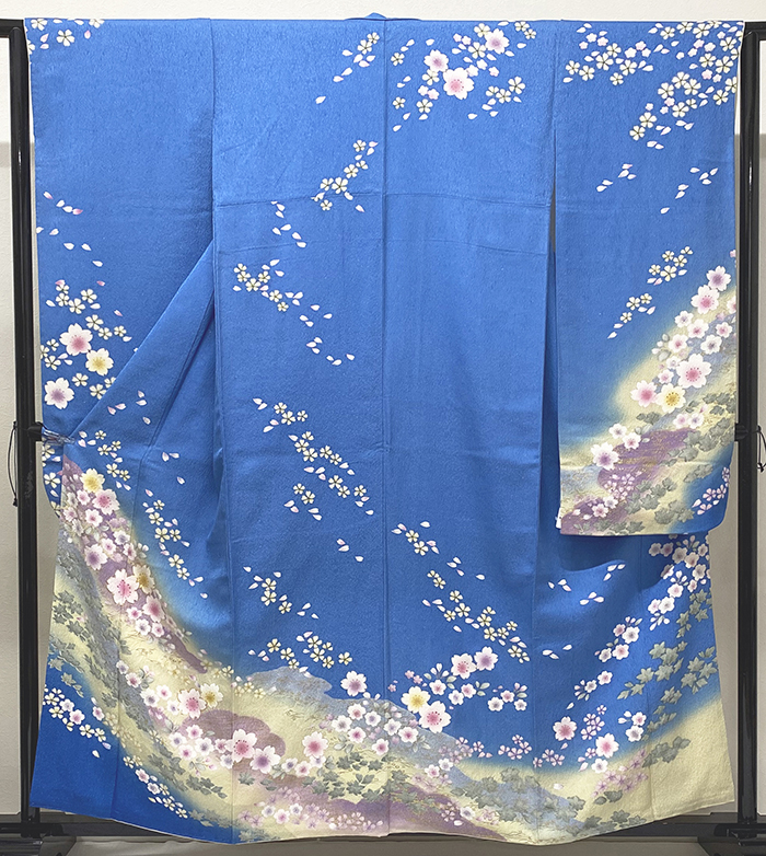 確りとした張りのある手触りの小さな凹凸と銀糸を霜降りに織り込んだ紋意匠の生地をコバルトブルー色に地染めし、淡いくすんだ黄色の裾暈しと、上前からの花柄を薄紫色や緑色・黄色・紅梅色・金彩などで重ね染めし、少しの金駒刺繍を加え仕上げた品。八掛けは正絹淡い黄色無地で胴裏は正絹が付いた手縫い仕立て。衿裏にはくるみホックが付いています。