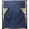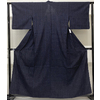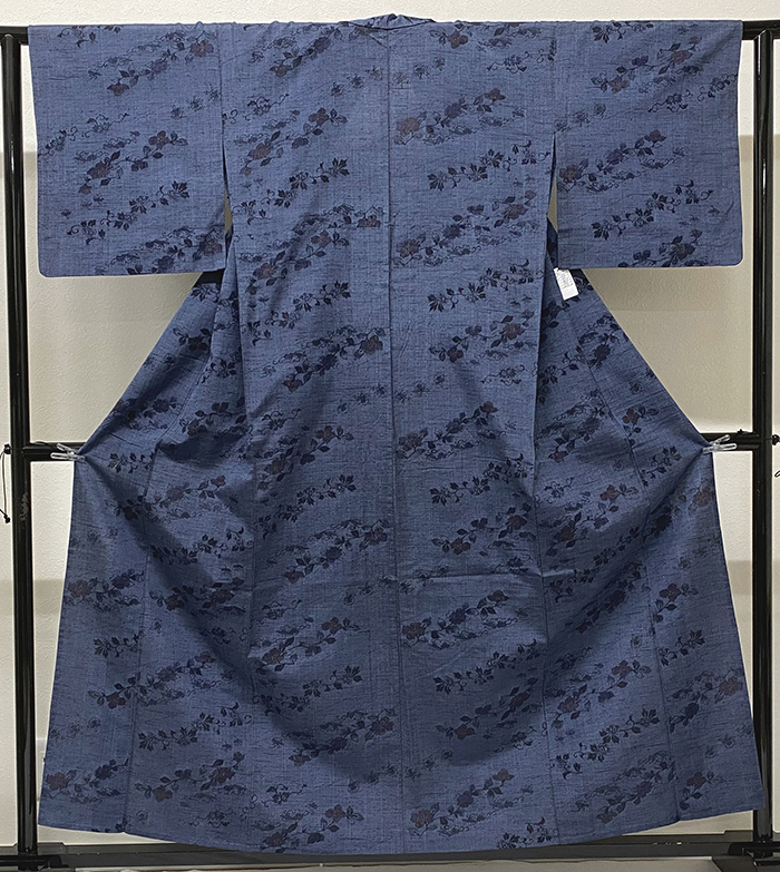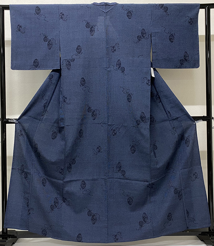 薄手で張りのある手触りで小さなフシを織り込んだ紬織りで、くすんだ紺色の地織りに、蔓花の柄をエンジ色や緑みの紺色などで重ね織りした品。背伏せは別生地が付き、正絹白の衿裏が付いた手縫いの単衣仕立て。