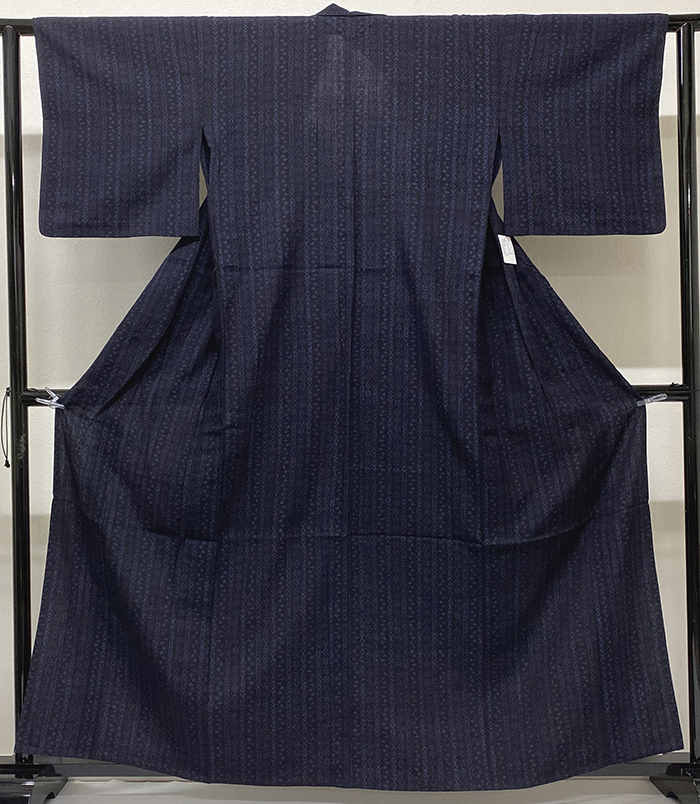 しなやかな手触りで小さなフシを織り込んだ小千谷紬織りで、濃紺の地織りに、花の縞柄を青ネズで重ね織りした品。背伏せは別生地が付き、正絹白の衿裏が付いた手縫いの単衣仕立て。