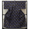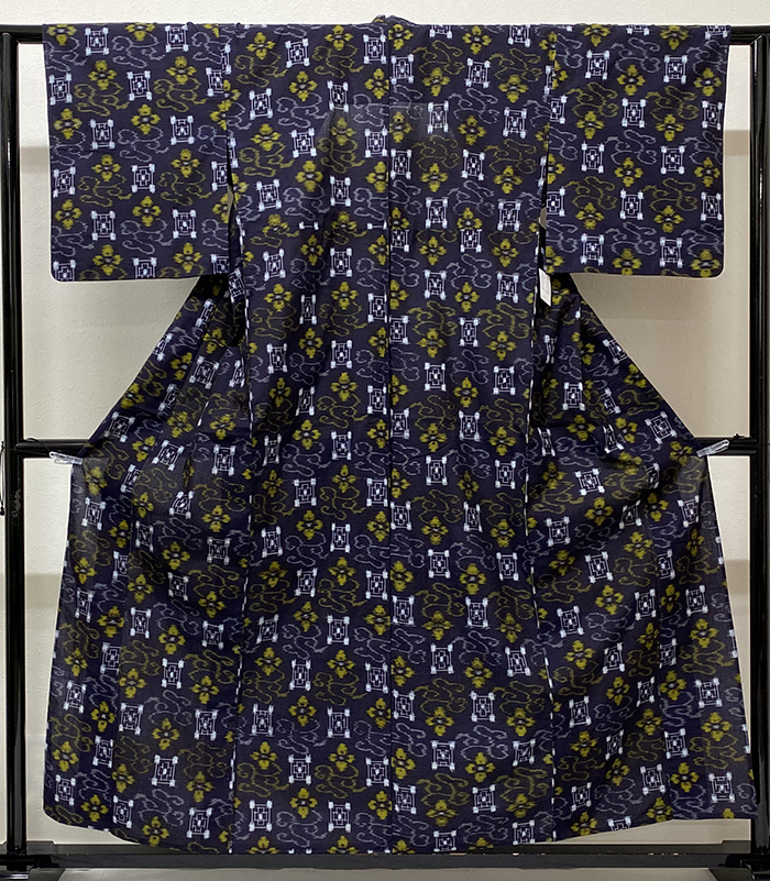 しなやかな手触りの木綿の織りで、黒に近い紺色の地織りに、絣柄を白と金茶で重ね織りした品。背伏せは共生地返しで、手縫いのバチ衿単衣仕立て。