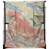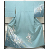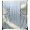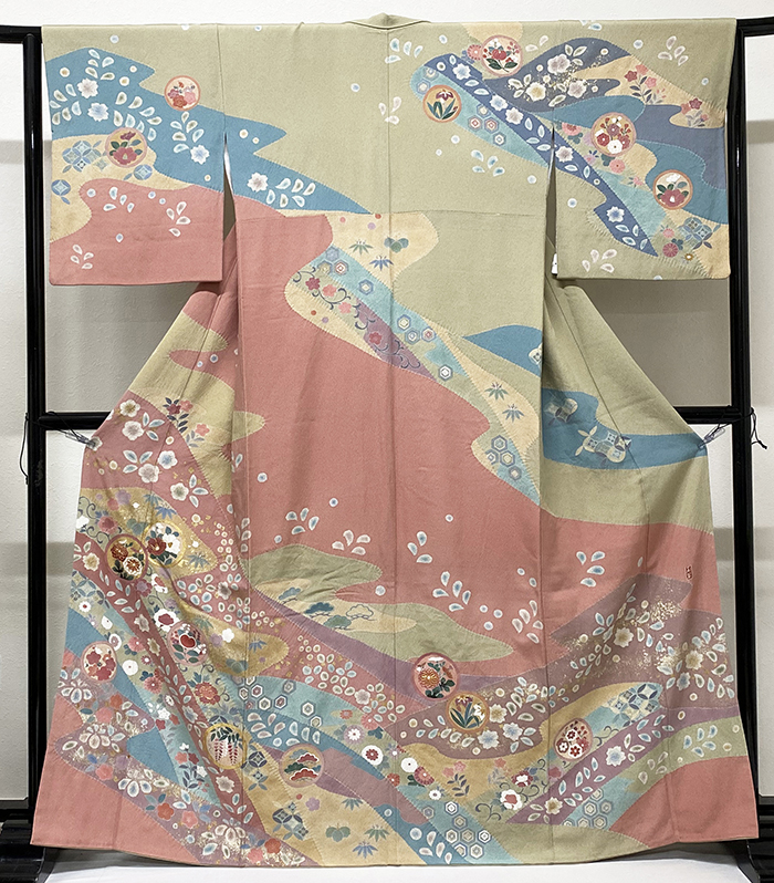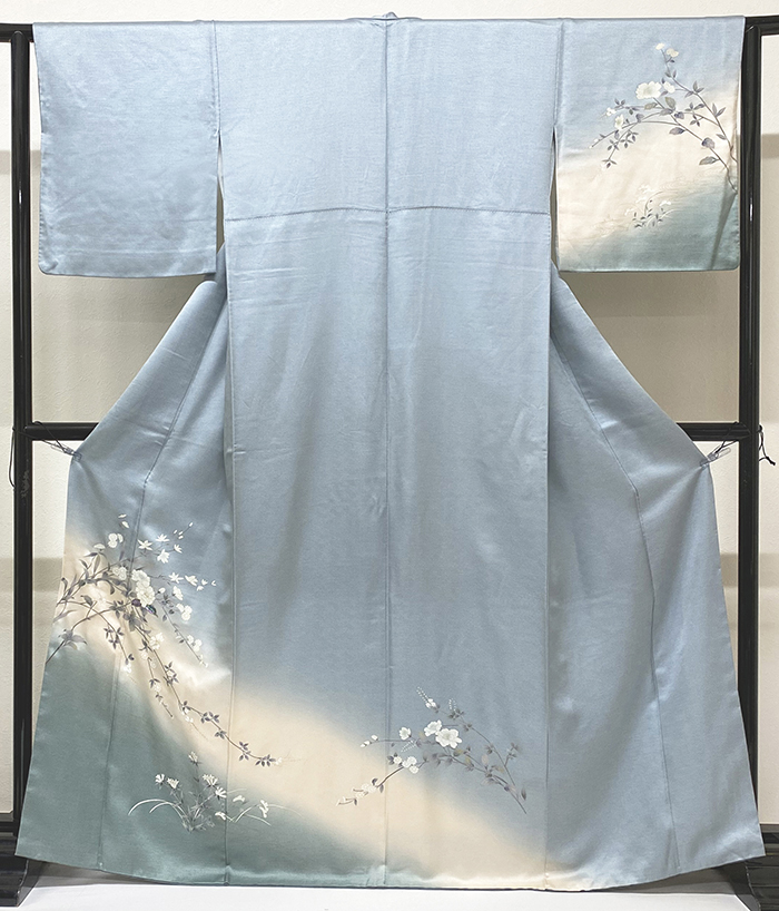 しなやかな手触りで少し光沢のある小さなサヤガタの地柄を織り込んだ紋意匠の生地をくすんだ青ネズ色に地染めし、上前からのベージュ色暈しとくすんだ青緑色の裾暈しと、枝花などの柄を白ネズ色で染め、葉柄に金銀彩と少しのラデン箔を加え仕上げた品。八掛けは正絹青緑色暈しで胴裏は正絹が付いた手縫い仕立て。衿裏にはくるみホックが付いています。
