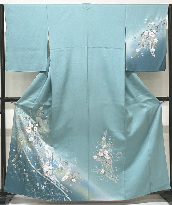 しなやかな良い手触りで光沢のある真砂の地柄を織り込んだ紋意匠の生地をターコイズブルー色に地染めし、上前からの納戸色の裾暈しと、光悦垣に扇や花などの柄を生成りの胡粉と、薄桃色や薄藤色・青緑色などの色箔や金銀彩に盛り金彩などにラデン箔を加え重ね染めした品。八掛けは正絹明るい退紅色暈しで胴裏は正絹が付いた手縫い仕立て。衿裏にはホック代わりに糸が付いています。