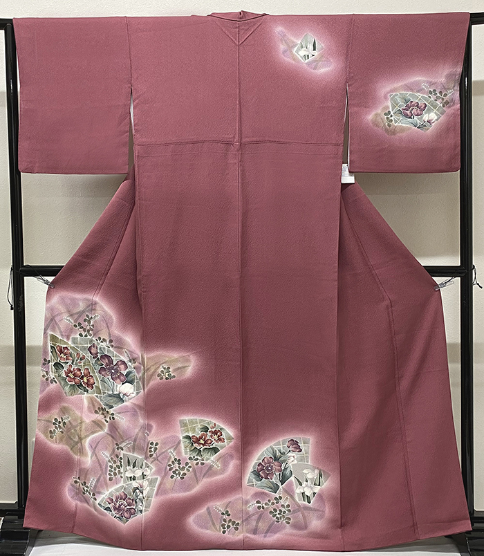 しなやかな手触りの小さな凹凸のある紋意匠の生地を明るい赤紫色に地染めし、上前からの地紙に花などの柄を薄い地色濃淡暈しと、青磁色や青緑色・紫色・白・山吹色などで重ね染めした品。八掛けは正絹くすんだ赤紫色暈しで胴裏は正絹が付いた手縫い仕立て。