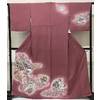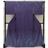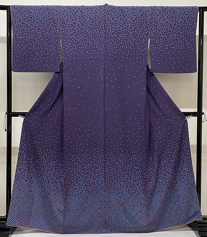 しなやかな手触りの変わり一越の生地をくすんだ濃い紫色に地染めし、小さな柄を青色や黄赤色などで重ね染めした品。八掛けは正絹退紅色に小花の柄を絵羽付けに染めた品が付き胴裏は正絹が付いた手縫い仕立て。