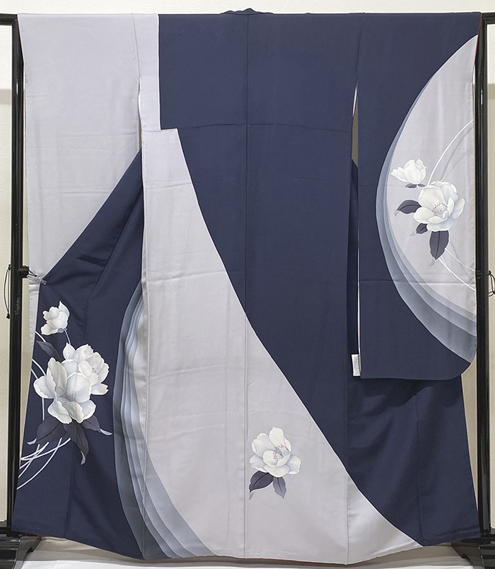 しなやかな手触りの無地意匠の生地を青みの墨黒と白ネズの染め分けに地染めし、上前からの花柄を薄ネズ色濃淡にエンジ色と銀彩を加え重ね染めした品。八掛けは正絹エンジ色無地で胴裏は正絹が付いた手縫い仕立て。衿裏にはくるみホックが付いています。