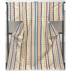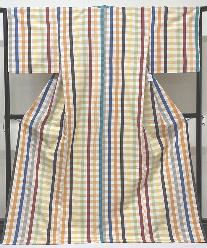 しなやかでやわらかな手触りの木綿の織りで、縞と格子の柄をエンジ色や紺色・薄緑色・薄いオレンジ色・黄色などで重ね織りした品。腰から下の後ろ幅一杯にポリエステル居敷き当てが付き、木綿白の衿裏が付いた手縫いの単衣仕立て。衿裏にはくるみホックが付いています。