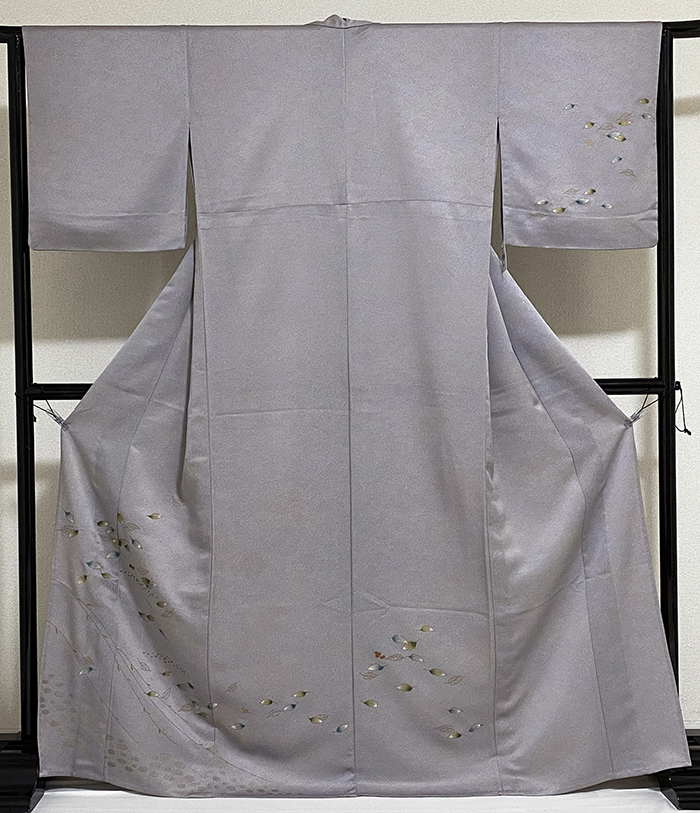 しなやかな手触りのポリエステル無地織り生地で、くすんだ青ネズ色にほんの少しのローズ色を加え小さなサヤガタの柄を染め、胸や上前の葉柄を緑色や黄赤色に青色と金銀彩を加えて染めた品。背伏せは共生地返しで、ポリエステル白の衿裏が付いたミシン縫いの単衣仕立て。