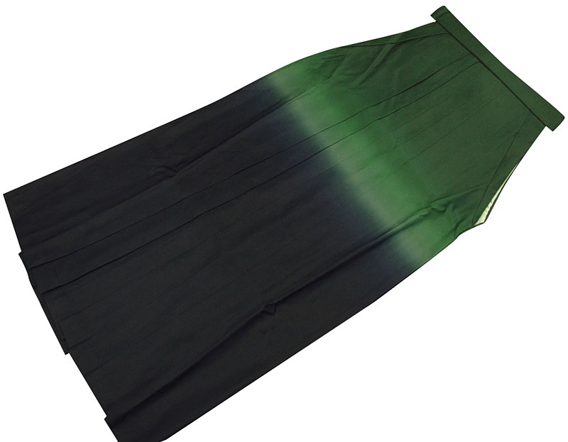 スベリの良い手触りで確りと打ち込まれたポリエステル変わり一越の生地を千歳緑に墨黒の裾暈しを加え染め上げた品。