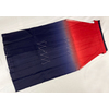 張りのある手触りのポリエステル無地意匠の生地を茜色と鉄紺の横段暈しで染め上げた品。