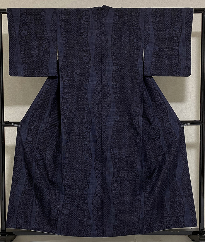 しなやかな手触りで少しのフシ糸を織り込んだ深い紺色の結城紬の地織りに、七宝や花柄などの柄を明るい青ネズの百山亀甲絣などの絣で重ね織りした品。八掛けは正絹くすんだ薄緑色無地で胴裏は正絹が付いた手縫い仕立て。