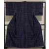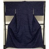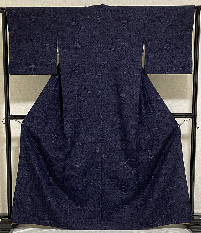 しなやかな手触りで小さなフシを織り込んだ深い紺色の結城紬の地織りに、木立や家などの柄を青ネズの八十山亀甲絣で重ね織りした品。八掛けは正絹赤茶色無地で胴裏は正絹が付いた手縫い仕立て。