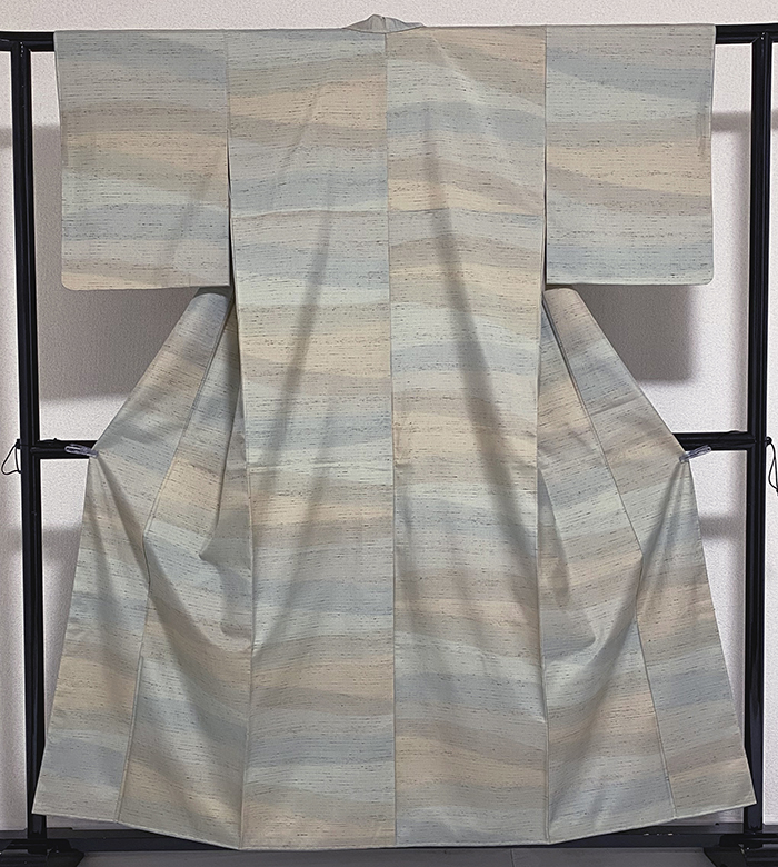 しなやかでスベリの良い手触りで横糸にこげ茶色のフシ糸を織り込んだ淡い薄緑色濃淡とベージュ色に渋い曙色の優しい色味の横段織り紬で織り上げた品。八掛けは正絹優しい青ネズ色無地で胴裏は正絹が付いた手縫い仕立て。衿裏にはくるみホックが付いています。