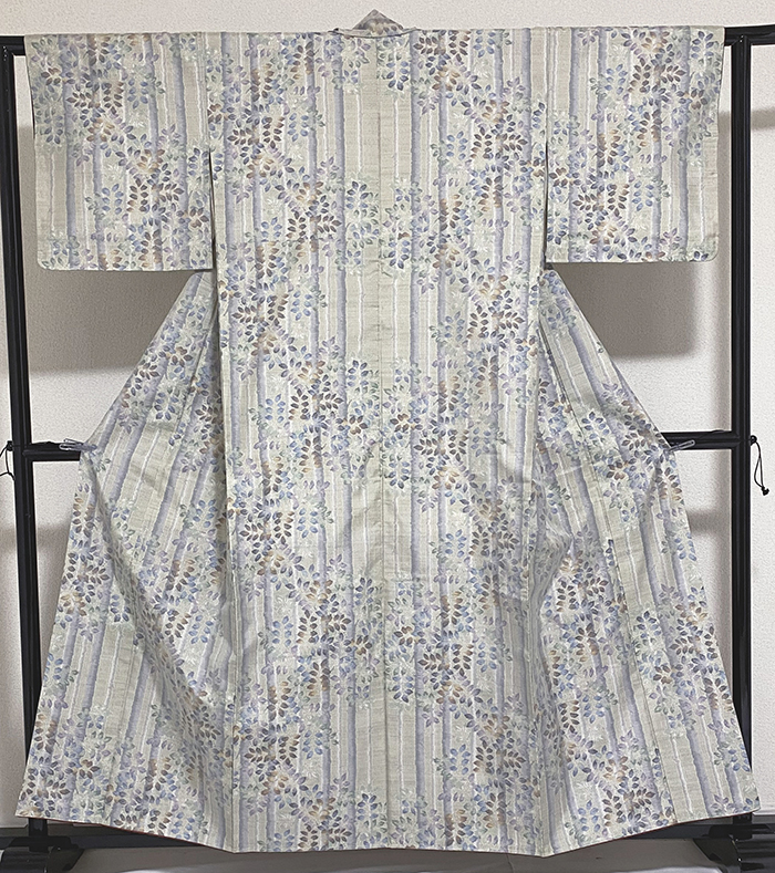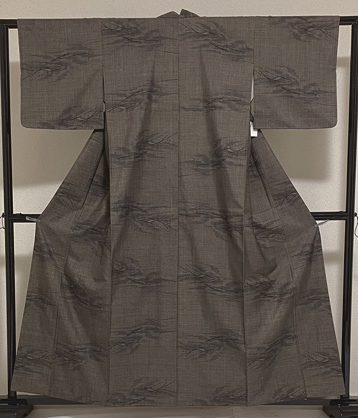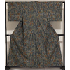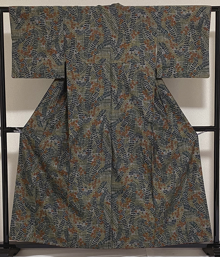 張りのある手触りで縦糸にフシ糸を織り込んだグレーの紬の地織りに、草花の柄を緑色濃淡と黄赤や金茶色などで重ね織りした品。八掛けは正絹エンジ色無地で胴裏は正絹が付いた手縫い仕立て。