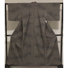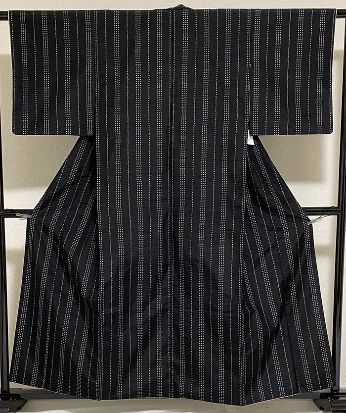 張りのある手触りで確りと打ち込まれ横糸にフシ糸を織り込んだ黒の紬の地織りに、縞柄を白の絣で重ね織りした品。八掛けは正絹濃いめのベージュ色無地で胴裏は正絹が付いた手縫い仕立て。衿裏にはホック代わりに糸が付いています。