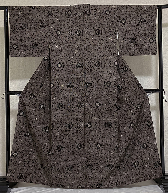 張りのある手触りで細糸で確りと打ち込まれた黒に近いこげ茶の大島紬の地織りに、蔓花の柄を白ネズの七マルキ縦横絣で丁寧に重ね織りした品。八掛けは正絹くすんだ薄小豆色無地で胴裏は正絹が付いた手縫い仕立て。