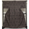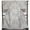 張りのある手触りで細糸で確りと打ち込まれた生成りに黒の横糸絣を重ねた大島紬の地織りに、木立の柄を薄紫に青ネズや金茶色などで重ね織りした品。八掛けは正絹暗いくれない色無地で胴裏は正絹が付いた手縫い仕立て。衿裏にはホック代わりに糸が付いています。