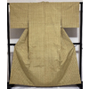 張りのある手触りで横糸にフシ糸を織り込んだ淡い金茶色の紬の地織りに、立涌風の縞柄を渋い金茶色で重ね織りした品。八掛けは正絹金茶色無地で胴裏は正絹が付いた手縫い仕立て。