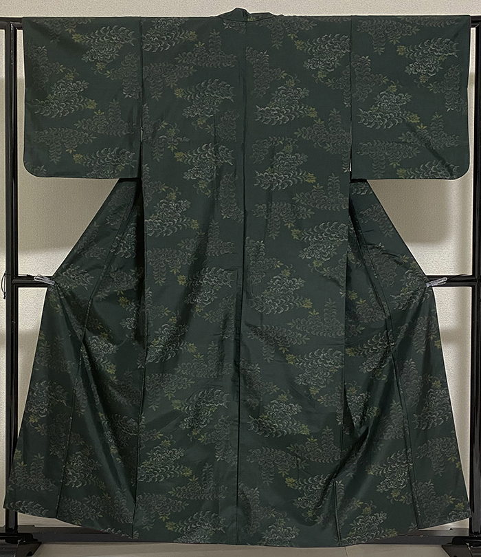 しなやかでスベリの良い小さな格子柄の上に花柄を織り込んだ本場大島紬織りで、くすんだ深い緑色の地織りに、花柄を白ネズ色と緑色の糸で織り上げた品。八掛けは正絹小豆色暈しで胴裏は正絹が付いた手縫い仕立て。