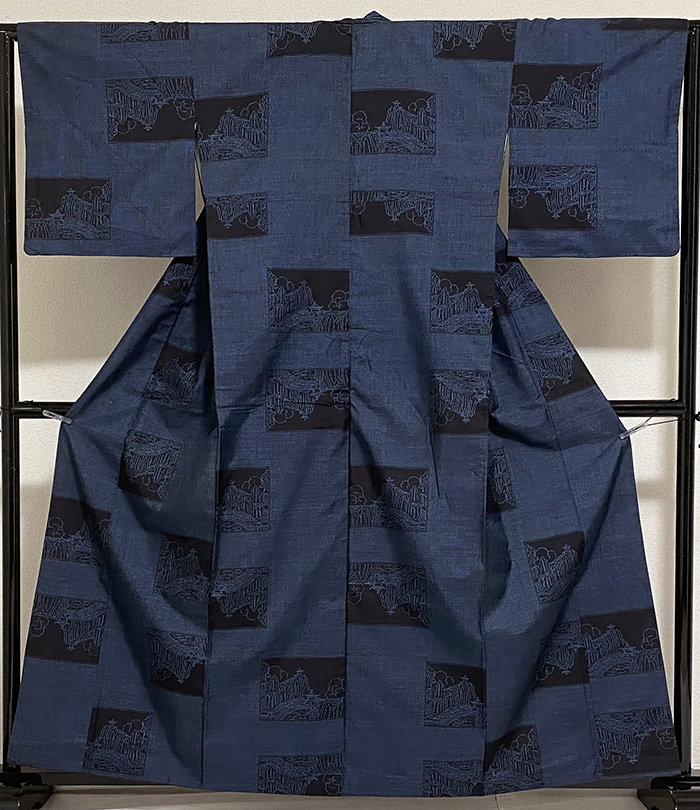 確りとした張りのあるスベリが良い大島紬織りで、深い紺色の地織りに、青糸で小さな縦横絣を織り、その上の四角取り風景柄を地色濃淡で織った品。八掛けは正絹小豆色無地で胴裏は正絹が付いた手縫い仕立て。