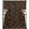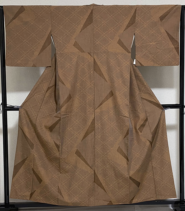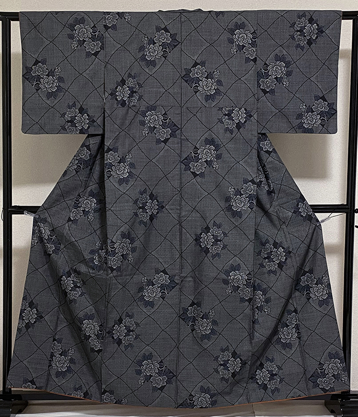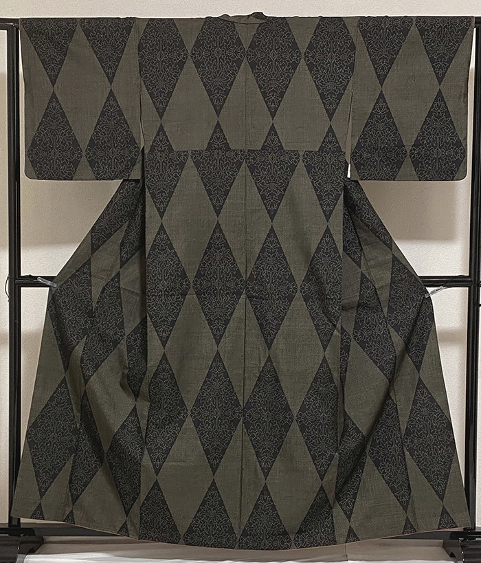 しなやかでスベリが良い大島紬織りで、黒の地織りに、金茶色の糸で小さな縦横絣柄を織り、その上の大きなダイヤ柄に花柄を織った品。八掛けは正絹金茶色無地で胴裏は正絹が付いた手縫い仕立て。衿裏にはくるみホックが付いています。