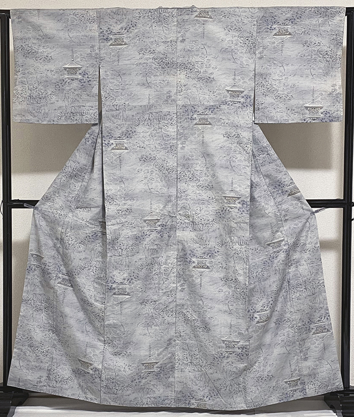 しなやかな手触りの小さなフシを織り込んだ紬織りで、白ネズ色濃淡地織りに、木立や塔の柄を黒や金茶色に白などで織った品。八掛けは正絹青ネズ色無地で胴裏は正絹が付いた手縫い仕立て。衿裏にはホック代わりに糸が付いています。