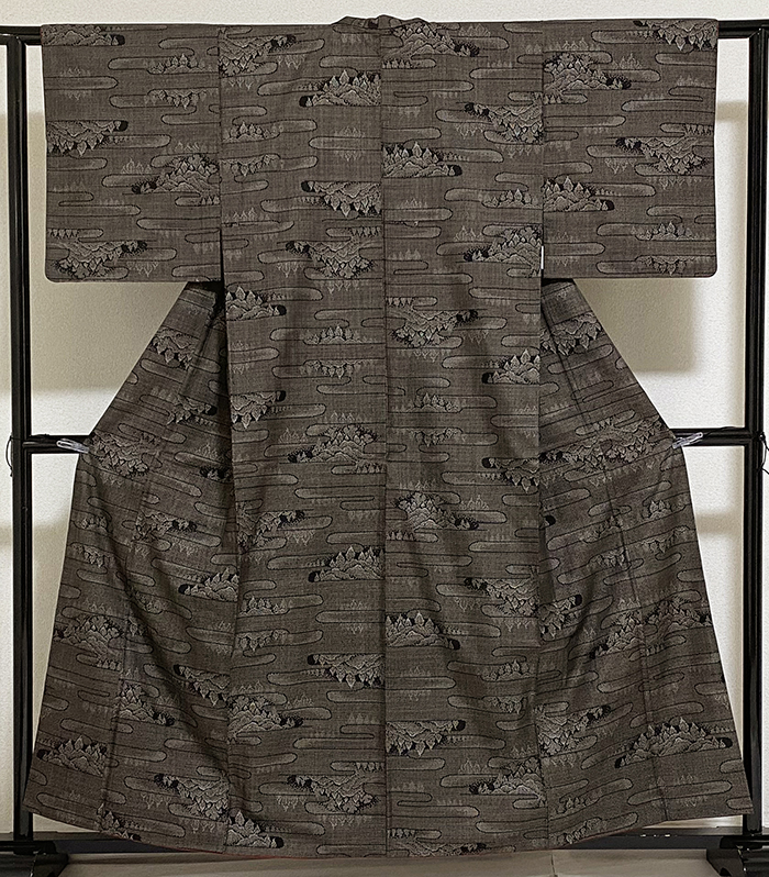 しなやかな手触りのスベリが良い大島紬織りで、黒に近いこげ茶色と薄茶色の小さな絣柄で雲や木立の柄を織った品。八掛けは正絹エンジ色無地で胴裏は正絹が付いた手縫い仕立て。