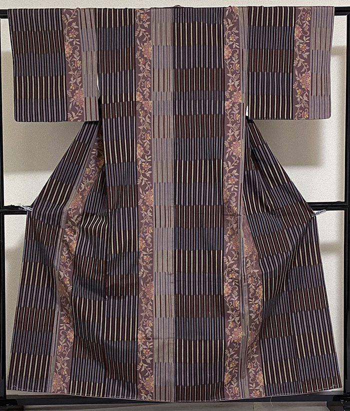 確りとした張りのある縦縞と花柄を織り込んだ紬織りで、黒に近い紫色や小豆色に青ネズ色の地織りに、花柄を薄小豆色や黄赤色などを加え織った品。八掛けは正絹薄藤色無地で胴裏は正絹が付いた手縫い仕立て。衿裏にはくるみホックが付いています。