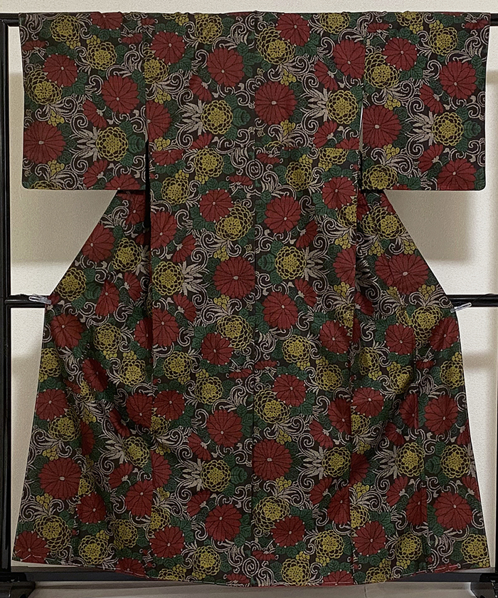 しなやかな手触りのスベリが良い小さな縦横絣柄で織られた大島紬織りで、黒に近いこげ茶色の地織りに、蔓花柄をエンジ色や緑色に金茶色などで織った品。八掛けは正絹エンジ色無地で胴裏は正絹が付いた手縫い仕立て。