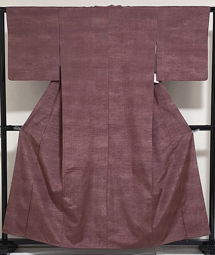 しなやかな手触りの小さなフシを横段に織り込んだ紬織りで、赤紫色濃淡の地織りに、細縞をエンジ色と青緑色で織った品。八掛けは正絹小豆色無地で胴裏は正絹が付いた手縫い仕立て。衿裏にはくるみホックが付いています。