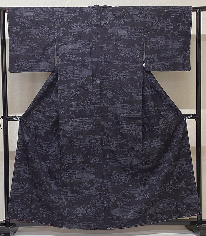 しなやかな手触りの真綿を紡いだ百山亀甲絣の結城紬織り生地で、黒の地織りに、白ネズ色で雲や花柄などを織り上げた品。八掛けは正絹エンジ色無地で胴裏は正絹が付いた手縫い仕立て。