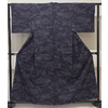 シャリ感のある手触りの良い塩沢紬織り生地で、黒に近い濃紺の地織りに、小さな霜降りと縞柄を青ネズ色で織った品。八掛けは正絹黒色無地で胴裏は正絹が付いた手縫い仕立て。