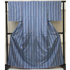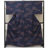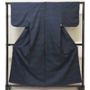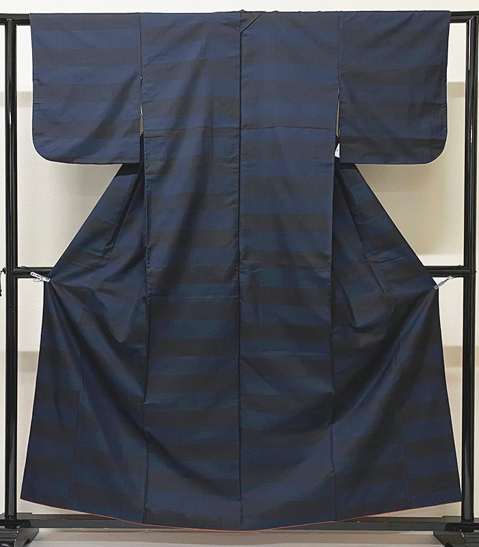 薄手でスベリの良い大島紬と思われる織りで、鉄紺色の深い色の地織りに、青ネズ色で横段柄を織った品。八掛けは正絹鮮やかな黄赤色無地で胴裏は正絹が付いた手縫い仕立て。