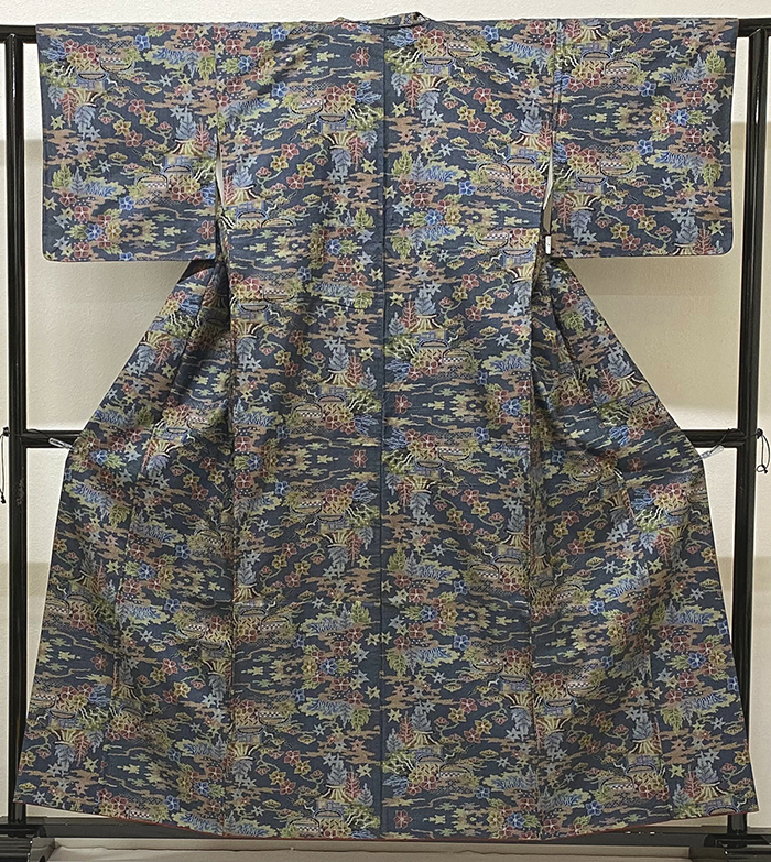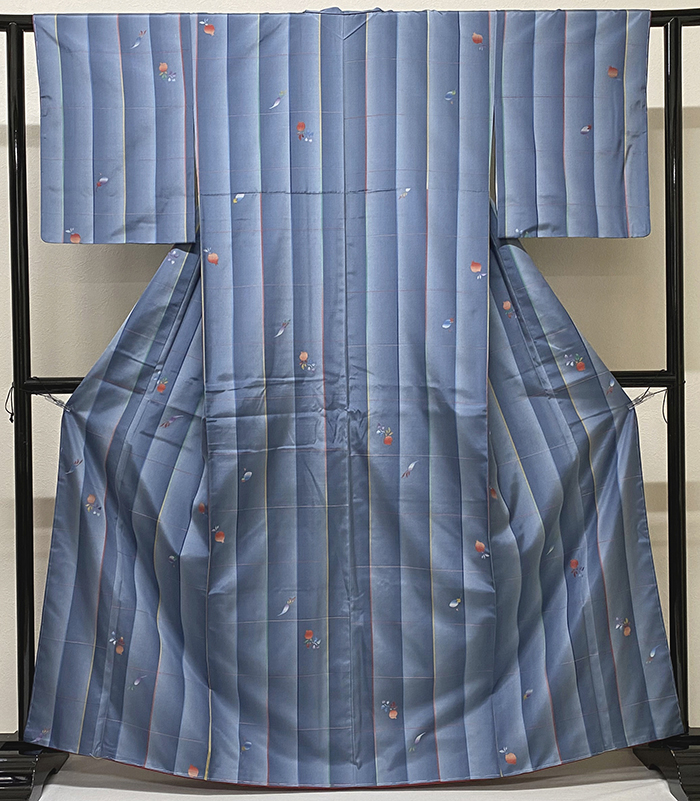 薄手でスベリの良い西陣織りの紬織り生地で、青ネズ色濃淡で縦縞柄を織り込み、茄子や蕪などの柄を紫色や黄赤色に緑色などで織った品。八掛けは正絹鮮やかなエンジ色無地で胴裏は正絹が付いた手縫い仕立て。衿裏にはホック代わりに糸が付いています。パールトーン加工済み、下前衿先裏にタグがあります。