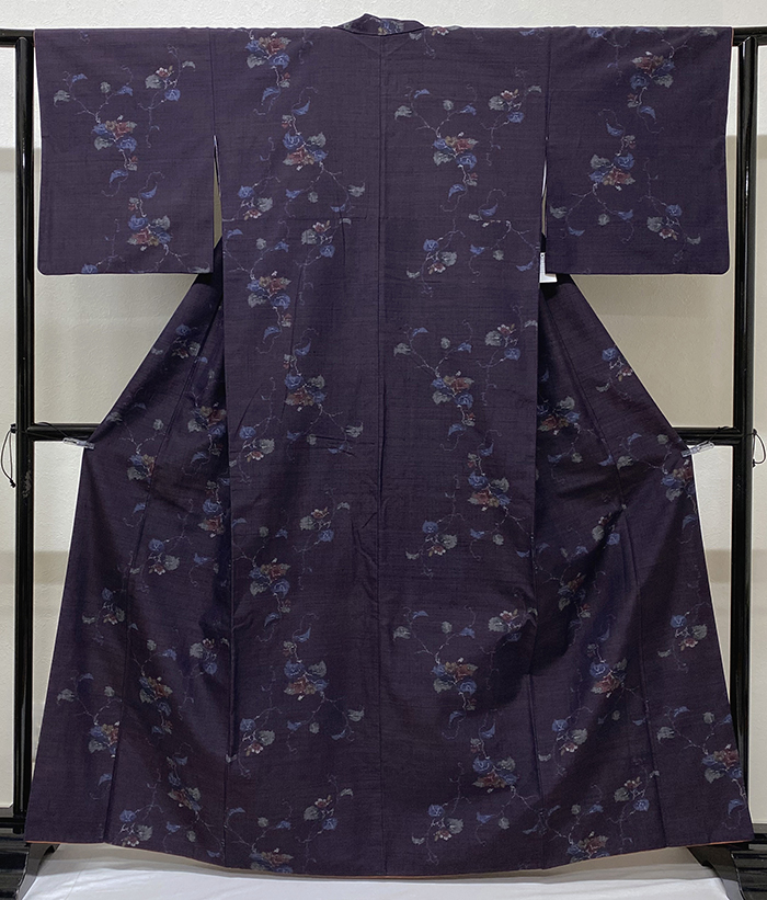確りとした手触りの小さなフシを織り込んだ紬の織りで、くすんだ小豆色の地織りに、蔓花の柄を白ネズ色と青色・エンジ色などで重ね織りした品。八掛けは正絹黄赤色無地で胴裏は正絹が付いた手縫い仕立て。