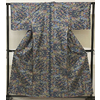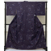 しなやかな良い手触りで細糸で確りと打ち込まれた大島紬の縦横絣織りに、黒の地織りに、濃紺濃淡の縦横絣を織り、花や木立などの柄をベージュ色や金茶色・赤紫色などで重ね織りした品。八掛けは正絹エンジ色無地で胴裏は正絹が付いた手縫い仕立て。