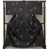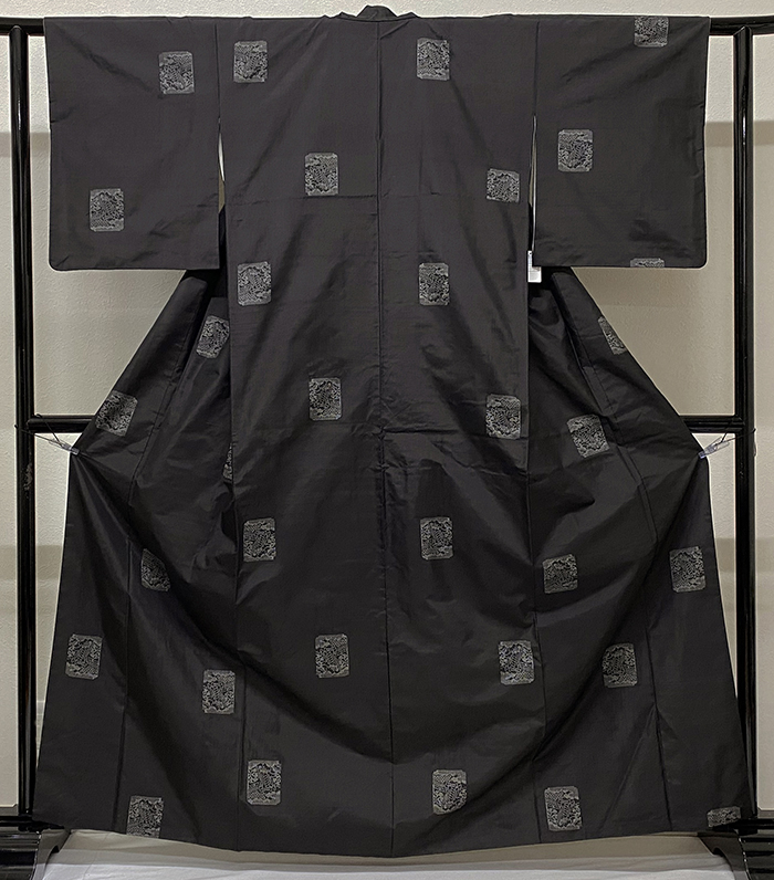 しなやかなでスベリの良い手触りで細糸で確りと打ち込まれた大島紬の織りで、黒の地織りに、四角取り山や花などの飛び柄を白の縦横絣で重ね織りした品。八掛けは正絹くすんだウグイス色無地で胴裏は正絹が付いた手縫い仕立て。