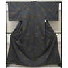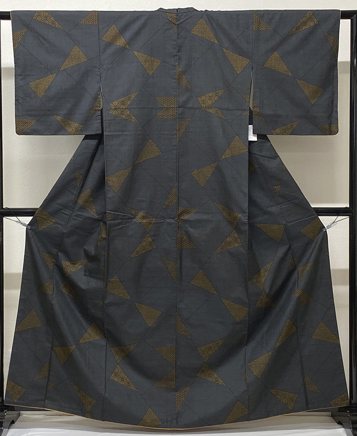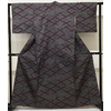 しなやかなスベリの良い手触りで細糸で確りと打ち込まれた大島紬の織りで、黒の地織りにキリバミの柄を濃紺色の縦横絣で織り、キリバミ取りサヤガタなどの柄をこげ茶色の縦横絣で重ね織りした品。八掛けは正絹辛子色無地で胴裏は正絹が付いた手縫い仕立て。