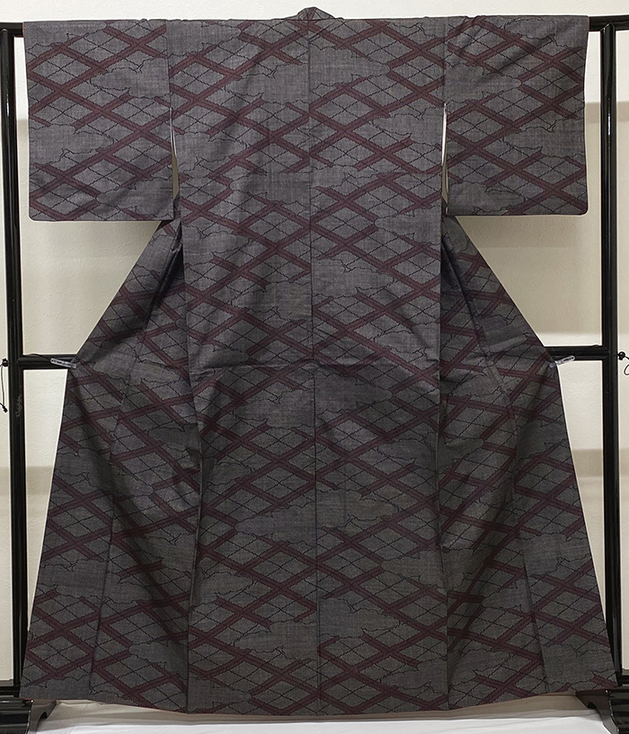 確りとした手触りで細糸で確りと打ち込まれた大島紬の織りで、黒の地織りに、雲や格子柄を白やエンジ色などで重ね織りした品。八掛けは正絹黄赤色無地で胴裏は正絹が付いた手縫い仕立て。衿裏にはホック代わりに糸が付いています。