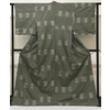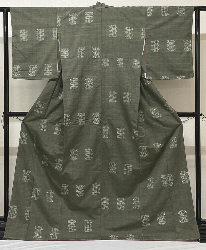しなやかな手触りで小さなフシを織り込んだ紬の織りで、大きな格子柄を赤紫色で織り込んだくすんだモスグリーン色の地織りに、四角取り抽象柄を白で重ね織りした品。八掛けは正絹エンジ色無地で胴裏は正絹が付いた手縫いのバチ衿仕立て。