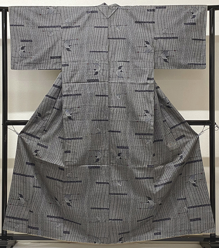 しなやかな手触りの十日町紬の織りで、黒の地織りに、縦縞柄を白ネズ色の絣で重ねた黒の地織りに、横段と鶴の柄を白ネズ色と少しのエンジ色・紫色などで重ね織りした品。八掛けは正絹明るい砥粉(とのこ)色無地で胴裏は正絹が付いた手縫い仕立て。